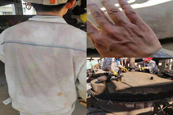大家都知道轉(zhuǎn)化現(xiàn)場(chǎng)溫度很高,而且近期外界氣溫已高達(dá)三十七八度。轉(zhuǎn)化現(xiàn)場(chǎng)溫度都接近于45度左右,如同一個(gè)大蒸籠,而轉(zhuǎn)化人員卻每天都在這個(gè)大蒸籠里工作;每每投甩完一臺(tái)轉(zhuǎn)化器后,衣服已全部被汗水浸透;到汗珠流到眼睛后,加之與氯化氫氣體接觸,眼睛完全睜不開;在拿掉塑膠手套的那一刻,一雙手被捂的發(fā)白發(fā)皺;如同在水里浸泡了數(shù)小時(shí)一樣,但是就在這樣的工作環(huán)境下,卻沒有一個(gè)人退縮,都在堅(jiān)守著自己的工作崗位,做出最大的奉獻(xiàn)。