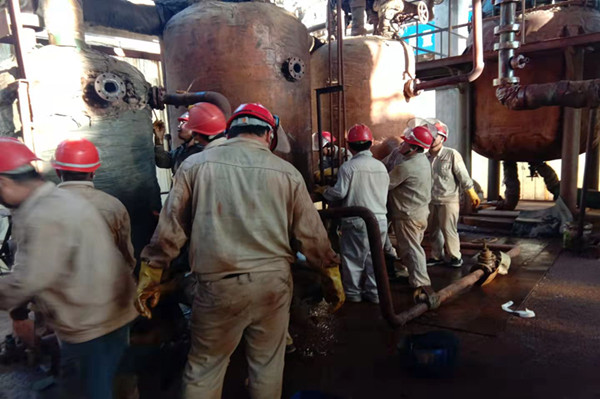 在完成了相關作業(yè)的準備工作,參與檢修人員穿戴好各類防護用品,辦理各類票證后,大家就進入到檢修現(xiàn)場。更換再沸器設備前,必須先排盡設備內(nèi)的氯化鈣,由于連接管線不能徹底排盡設備管線內(nèi)物料,只能通過人工接力的方式,將管線剩余的氯化鈣一桶一桶的接出,并迅速的倒入回收貯罐內(nèi)。整個過程必須密切協(xié)作,否則就會造成氯化鈣的大量外溢,在環(huán)保壓力如此大的今天,是絕對不容許的。經(jīng)過近一個小時的努力,設備管線內(nèi)的氯化鈣終于排放干凈。此時每個人的臉上都浸滿了汗水,這也是檢修人員最美麗的時刻。