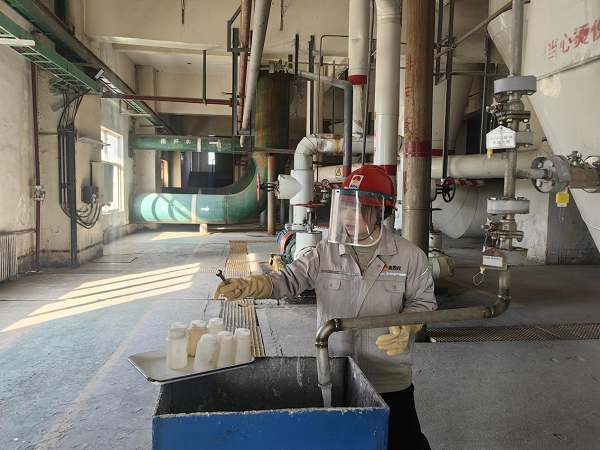 她們拎著貼好標簽的取樣瓶,快步走向鹽硝廠房的各個取樣點,回來時,取樣瓶里裝著各色各樣的樣品,有的是晶瑩剔透的液體,在瓶中輕輕晃動,泛起細碎的漣漪;有的是白色的晶體顆粒,隨著腳步的顛簸,發(fā)出“沙沙”的輕響;還有的是粘稠的漿液,掛在瓶壁上,緩緩滑落。將樣品放置在滴定檢測區(qū)的那一刻,瓶身與臺面碰撞,發(fā)出“!钡囊宦暣囗,像是為接下來的化驗工作,敲響了開場的鼓點。