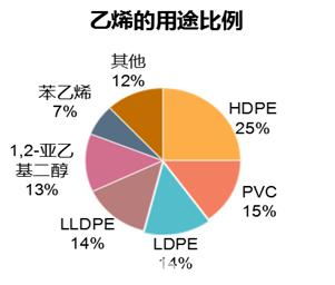 聚乙烯(簡(jiǎn)稱“PE”)以及聚氯乙烯(簡(jiǎn)稱“PVC”),都與乙烯有相當(dāng)密切的聯(lián)系。乙烯源于液化天然氣、液化石油氣、輕柴油、重油或原油等經(jīng)裂解產(chǎn)生的裂解氣中分出,亦可以從焦?fàn)t煤氣中產(chǎn)生,還可以從乙醇脫水中獲得。在全球聚乙烯制作方法中,其中44%為原油產(chǎn)出石腦油制乙烯,43%為天然氣產(chǎn)出乙烷氣制乙烯,13%為煤炭/天然氣產(chǎn)出甲醇制乙烯。在乙烯的所有用途中,PE和PVC對(duì)乙烯的使用量最大,分別占比53%和15%。