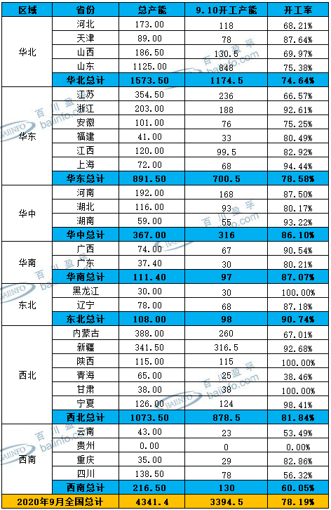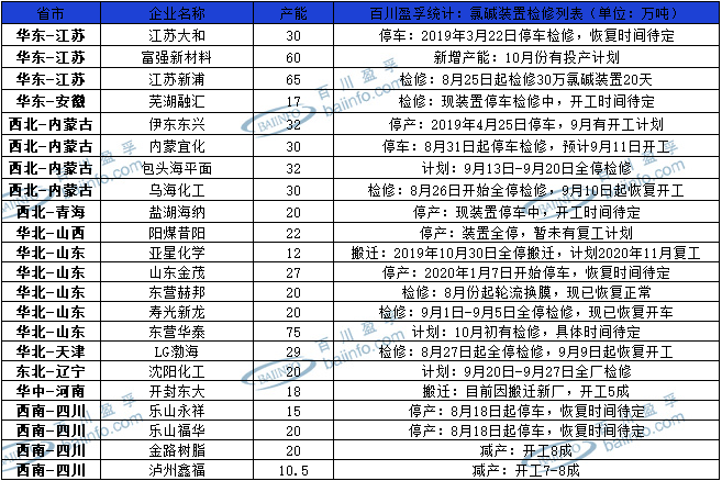 2020年9月份涉及檢修的廠家較少,整體開工變化不大,主要因山東、新疆、內(nèi)蒙、河北等氯堿大省氯堿企業(yè)基本上半年完成檢修工作。
