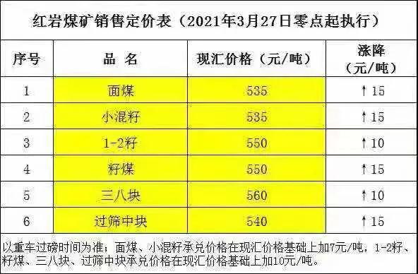 惠寶煤礦3月27日起現(xiàn)金銷售價格:原煤495元,面煤500元,中塊500元,三八塊520元。
