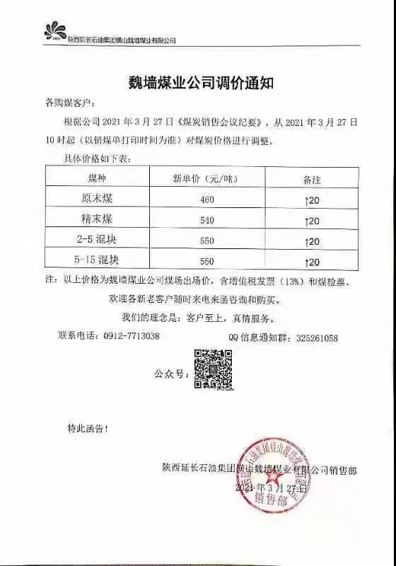 朱家峁煤礦(3月27日)14時對末煤、一三籽、混塊價格各上調(diào)20元/噸,以下磅時間為準!請各客戶及時合理安排發(fā)運!