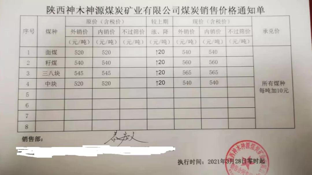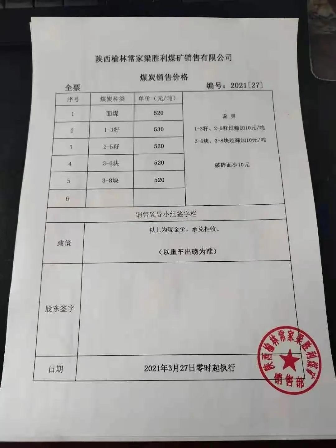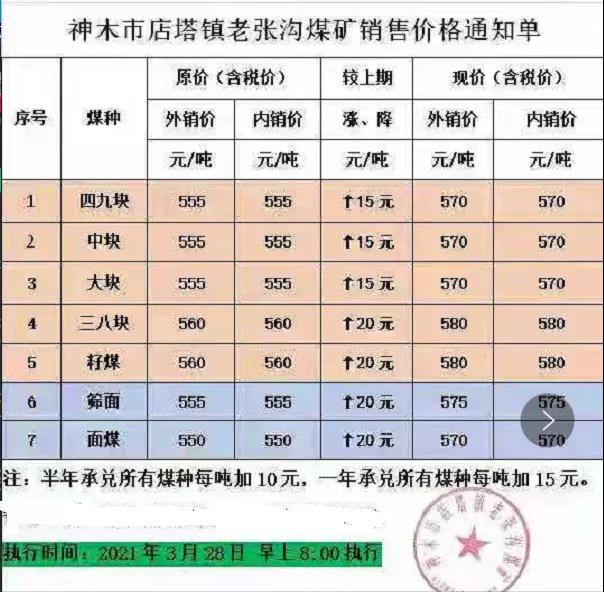 2021年3月28日早7點大砭窯煤礦:面煤漲80元,所有塊煤漲價40元。